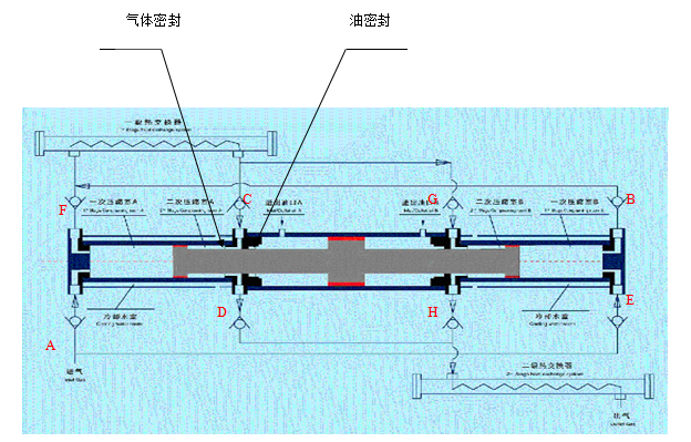 1、活塞桿向右運動時,槽車內氣體由A進入左邊氣缸的一級腔(一級進氣),而右邊一級腔的氣體則壓縮后經B流出,進入冷卻器,完成一級壓縮過程;同時,冷卻后的氣體由G進入二級腔(二級進氣),左邊氣缸二級腔內的氣體則壓縮后經D流入二級冷卻器,然后排出。