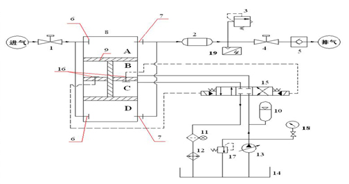 結構原理:工字形活塞桿將上面氣缸分隔為A、B兩個腔,將下面氣缸分隔為C、D兩個腔,如下圖: