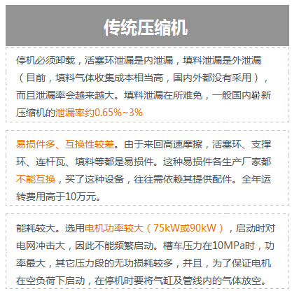 (5)維護費用高。易損件多、互換性較差。由于來回高速摩擦,活塞環、支撐環、連桿瓦、填料等都是易損件。這種易損件各生產廠家都不能互換,買了這種設備,往往需依賴其提供配件。