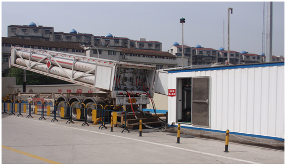 液壓平推設備系統工藝的CNG加氣子站,由專用槽車、液壓工作橇、售氣機等組成。其工作原理是:液壓工作橇提供高壓油,通過一系列控制閥逐次注入專用槽車的每只長管鋼瓶內,將長管鋼瓶內的天然氣以20MPa的恒定壓力推出來,從而通過售氣機給汽車加氣。如下圖:左邊是專用槽車,右邊是液壓工作撬。